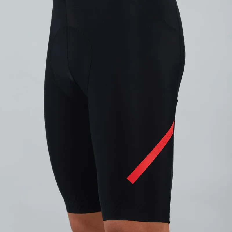 The bib shorts use a compact and windproof fabric with a water-resistant treatment that means light rain will bead off and you’ll stay drier and warmer for longer. The shorts are constructed with a single seam to minimise any points where water can enter. Raw-cut leg endings keep a sleek design and have grippers to hold the short in place as well as an open structure to prevent muscle fatigue.